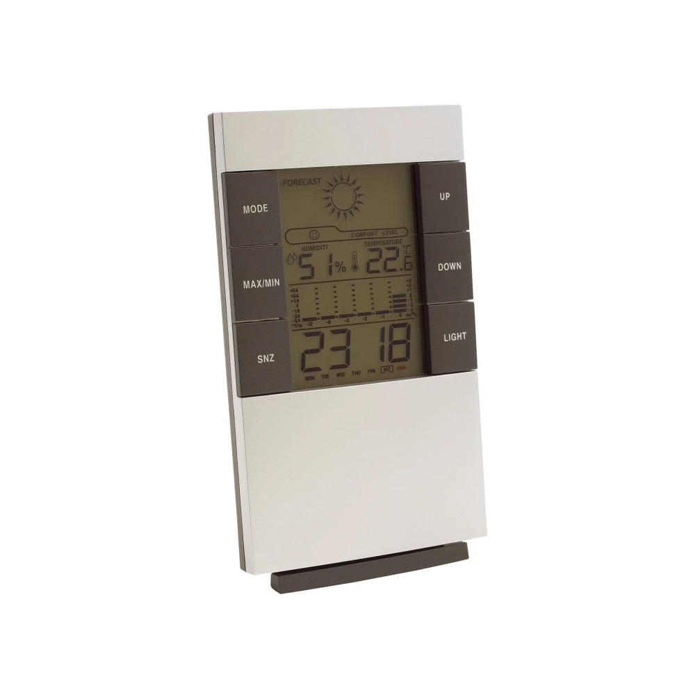 Метеорологична станция Sunny Times. Включва LCD екран, будилник, дата, термометър и фаза на луната. Дисплеят е със синьо фоново осветление. Поставката може да се сваля.