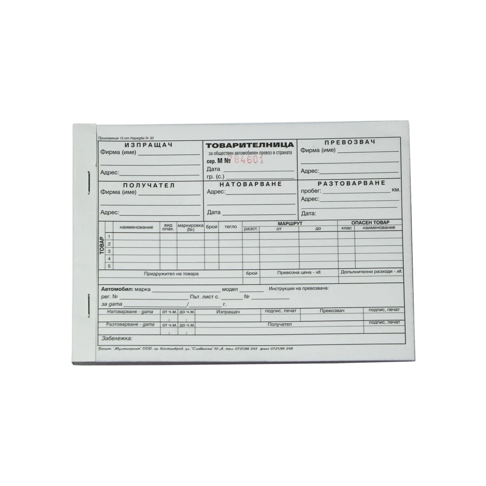 Товарителница, номерирана, химизирана, 100 листа, 3 екземпляра
