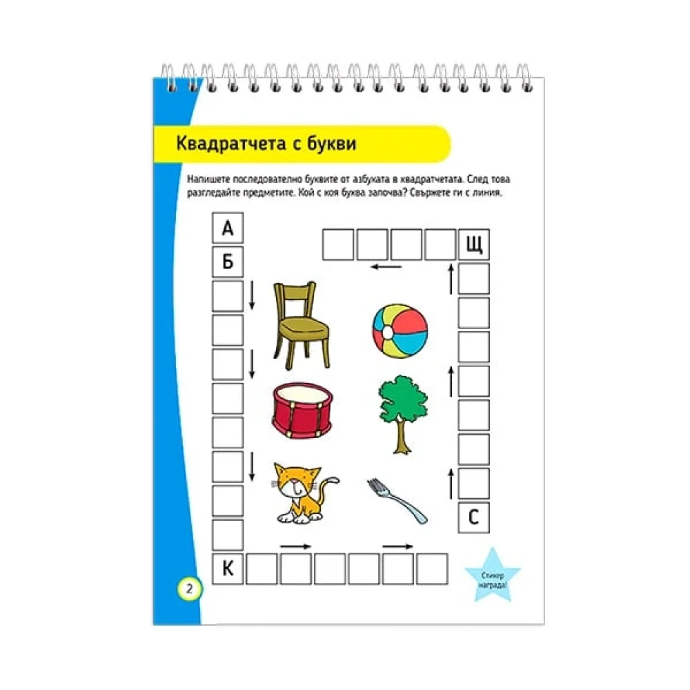 Книгата включва: - Гласни и съгласни; - С коя буква започва думата; - Последователност на азбуката; - Липсващи думи; - Главни букви; - Точки, въпросителна и запетая; - Въпроси/отговори/ по текст; - Четене; - Разказ по картинки; - Азбучен ред; - Други забавни игри.