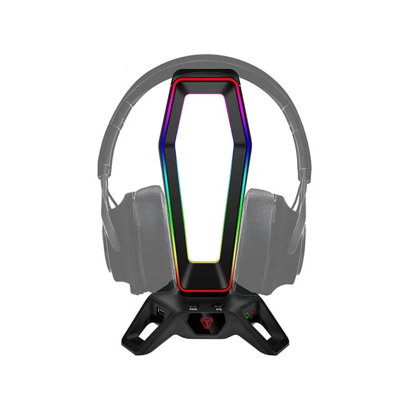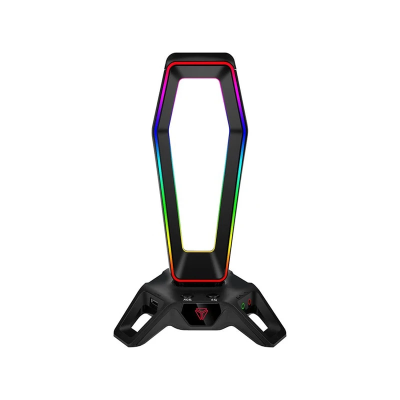 3 в 1: стойка за слушалки с RGB светлина, USB хъб и звукова карта.