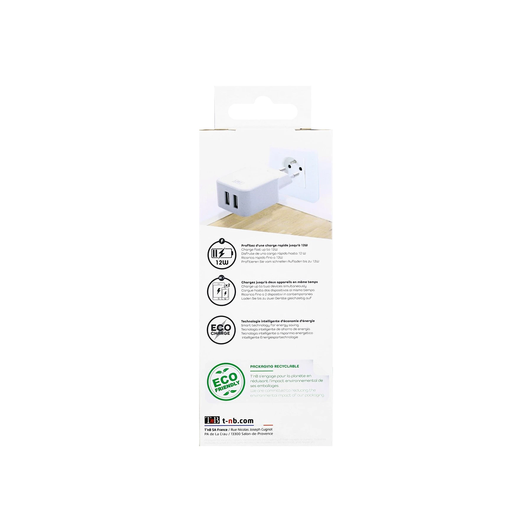 Зарядно устройство TNB, 2 USB, 2.4 A, 12 W, бяло