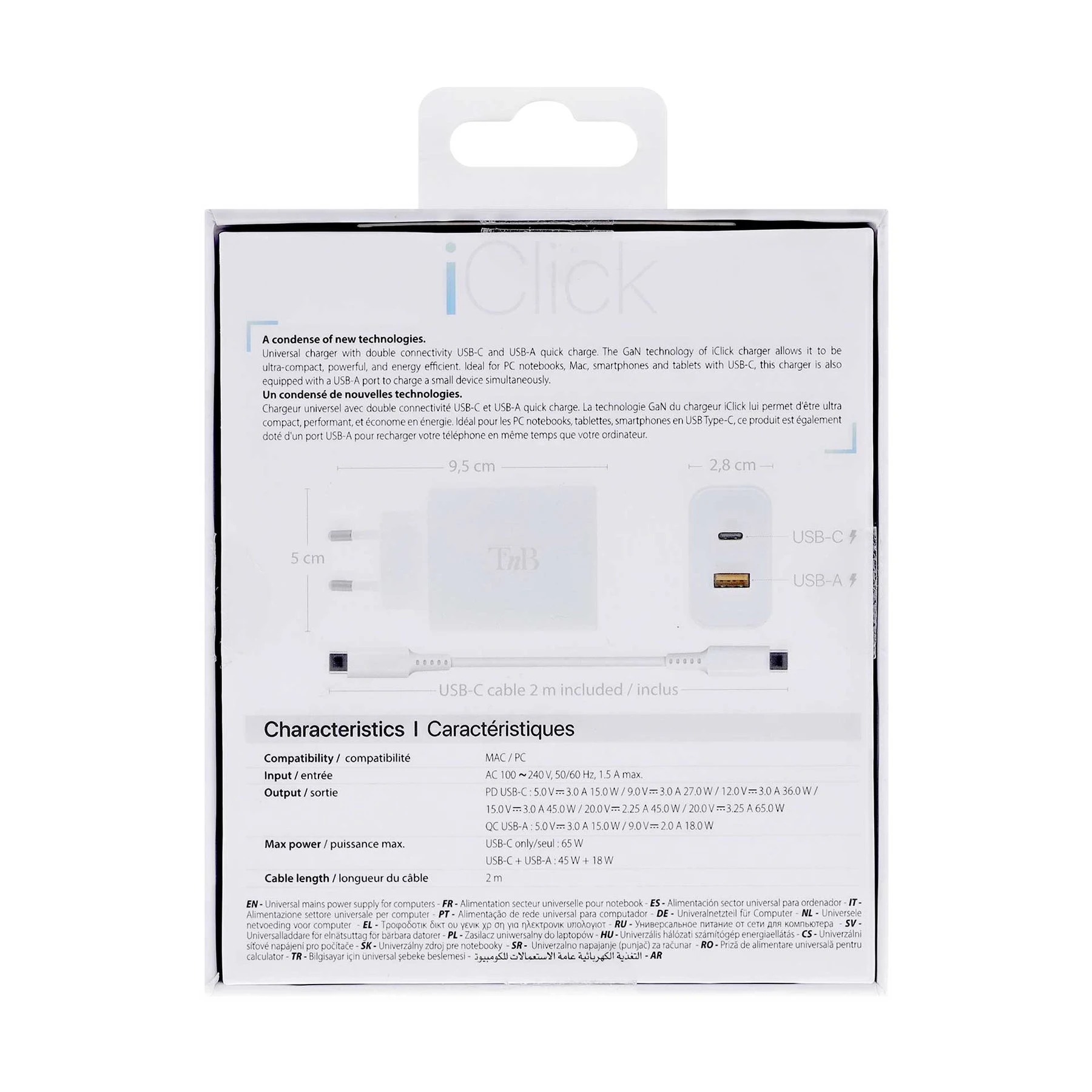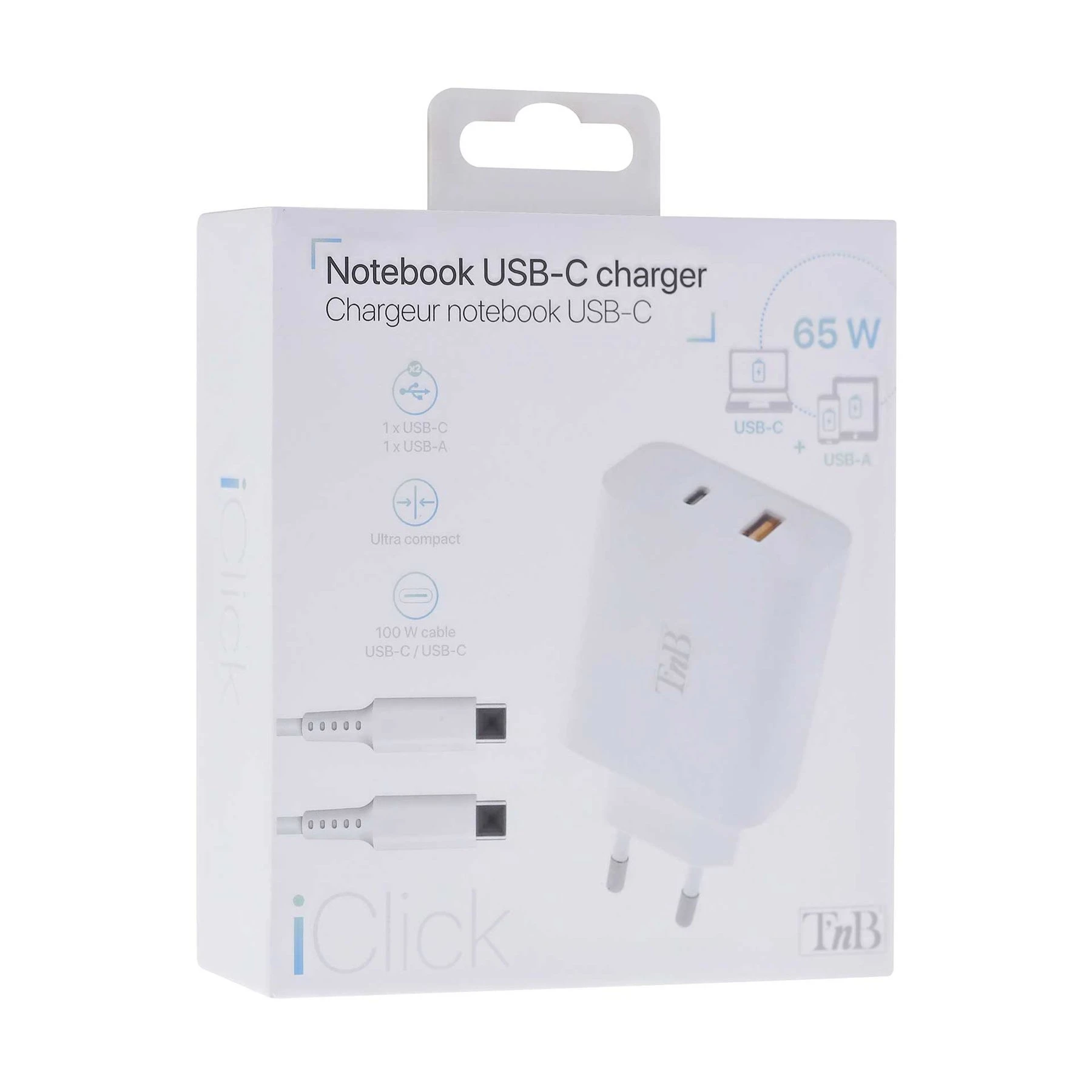 Зарядно устройство TNB iClick, за лаптоп и смартфон, 65W, USB Type-C, USB Type-A, дължина 2 m