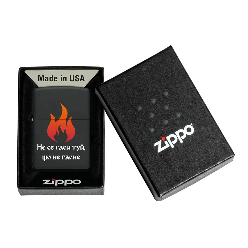 Тази запалка Zippo улавя жизнения дух на България чрез силно послание и изчистен дизайн. Част от колекция, създадена специално за българския пазар, моделът отдава почит на културното наследство на страната. Върху черната матова повърхност е отпечатан цитатът „Не се гаси туй, що не гасне“ от едноименното стихотворение на Иван Вазов, допълнен от емблематичния за Zippo символ на пламък.