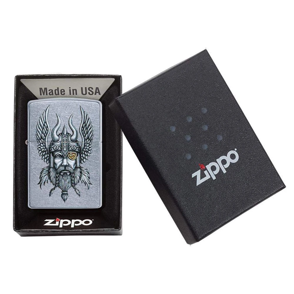 Дизайнът Nordic Viking се появява за първи път върху запалка Zippo с покритие Street Chrome™ и впечатлява със силно художествено излъчване и богата символика. Оригиналната визия е създадена от художниците на Zippo като ръчно рисувано произведение с писалка и мастило, което по-късно е прецизно прехвърлено в дигитален формат, за да се запазят всички детайли и нюанси.