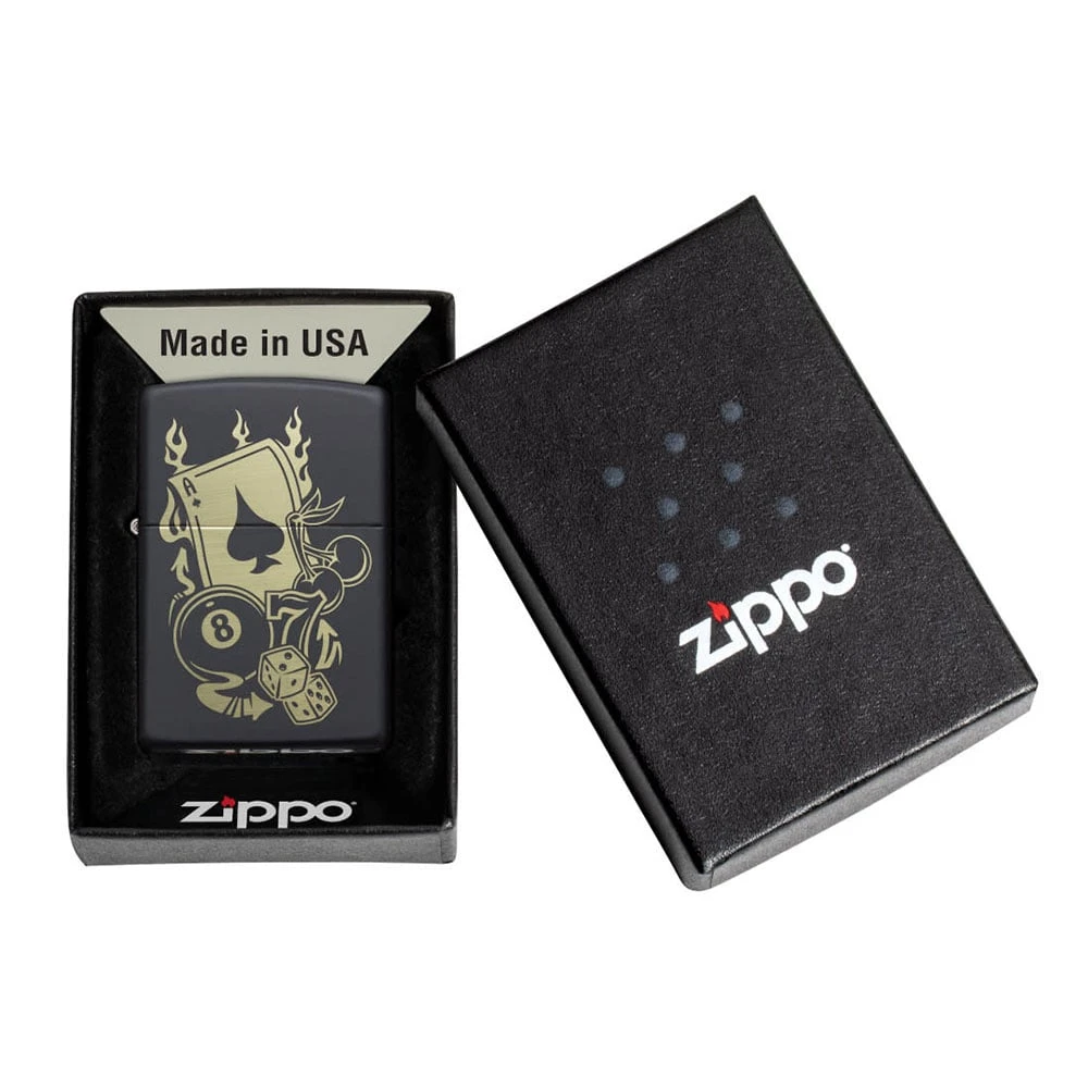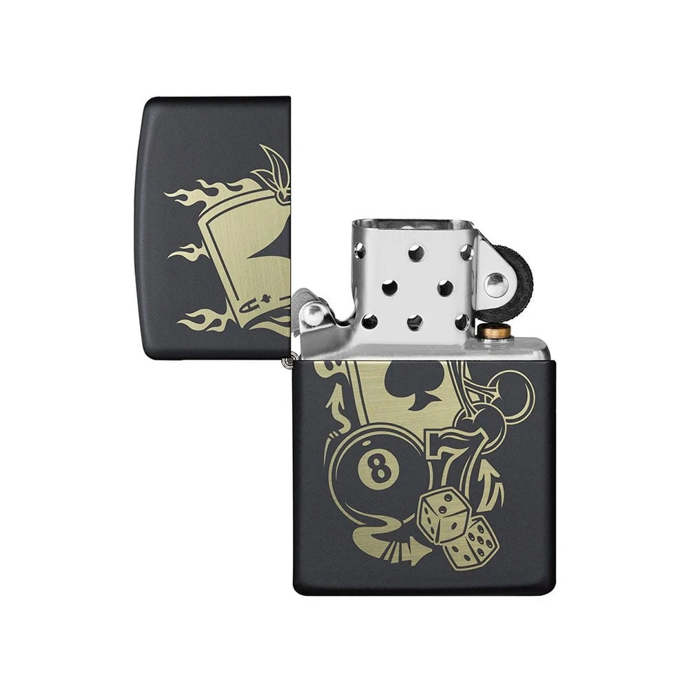 Вземете късмета в свои ръце или джоб с тази запалка Zippo с хазартен дизайн, вдъхновен от атмосферата на казиното. Върху черната матова повърхност са лазерно гравирани емблематични символи като асо, щастливото число 7, чифт зарове и други детайли, свързани с играта и късмета.